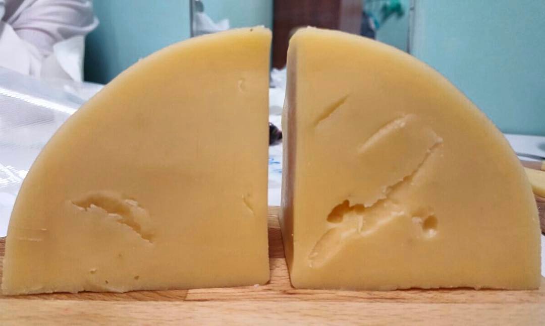 Сырное тесто желтого цвета, текстура закрытая, возможно с небольшим количество глазков. Вкус сыра ореховый с сладкими и карамельными нотами.